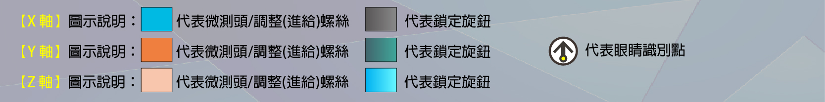 左右滑動看表格①MDS-②25③X④C⑤L-②25③Y④C⑤L-②25③Z④C⑤L⑥U X軸 Y軸 Z軸 ①手動軌道模式 ②台面尺寸 ③傳導方向 ④ 微測位置 ⑤鎖定旋鈕位置 ⑥Z軸移動方向