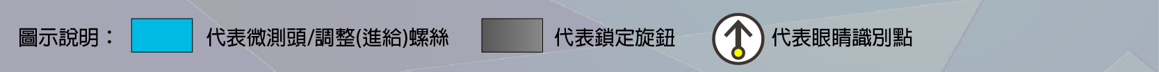 ①手動軌道模式 ②台面尺寸 ③傳導方向 ④微側頭位置 ⑤鎖定旋鈕位置