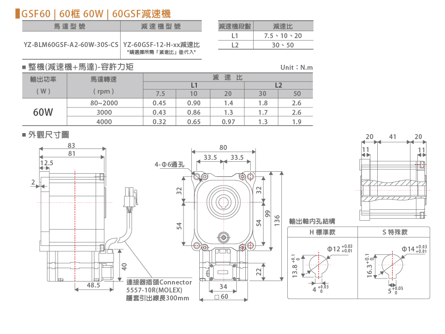 左右滑動看表格馬達型號表示 YZ BLM60GSF A2 60W 30S CS YZ公司 GSF系列 無刷馬達