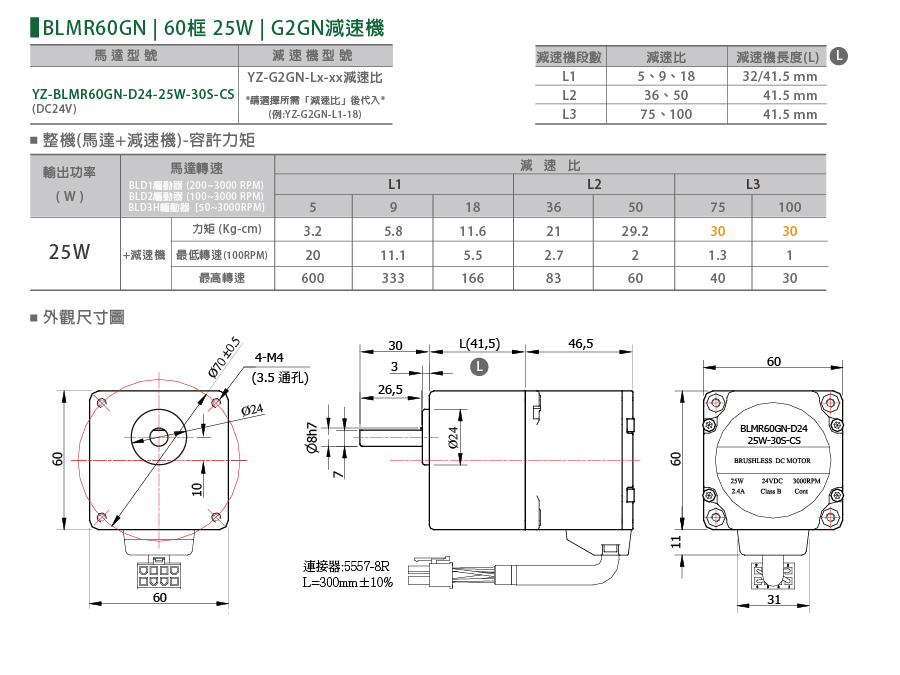左右滑動看表格馬達型號表示 YZ BLMR60GN D24 25W 30S CS YZ公司 BLMR系列 無刷馬達