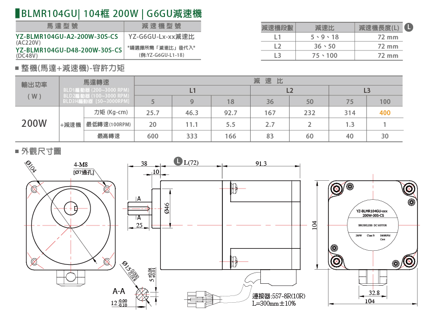 左右滑動看表格馬達型號表示 YZ BLMR104GU A2 200W 30S CS YZ公司 BLMR系列 無刷馬達