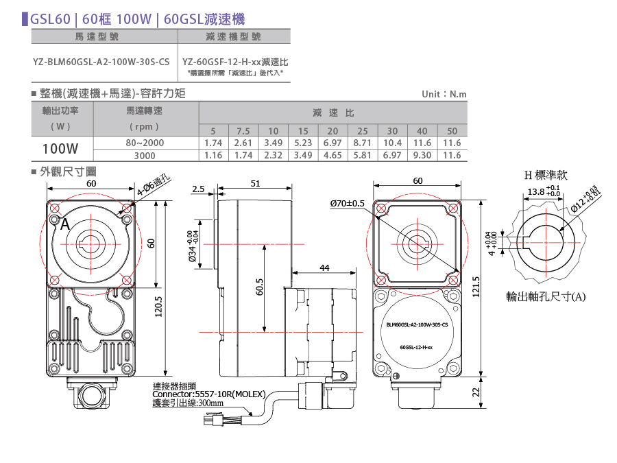 左右滑動看表格馬達型號表示 YZ BLM60GSL A2 100W 30S CS YZ公司 GSL系列 無刷馬達
