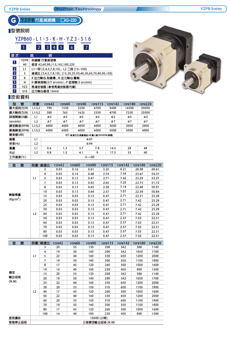 明YZ- PB60- L1 - 5 - K - H - P3 - S16 公司名 系列名 段數 減速比 馬達軸心 背隙 馬達品牌/瓦數 出力軸 規格選擇 PB42