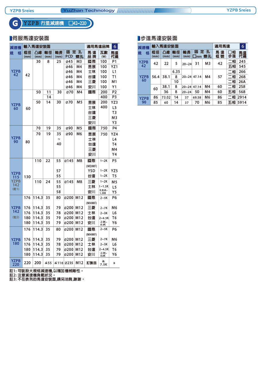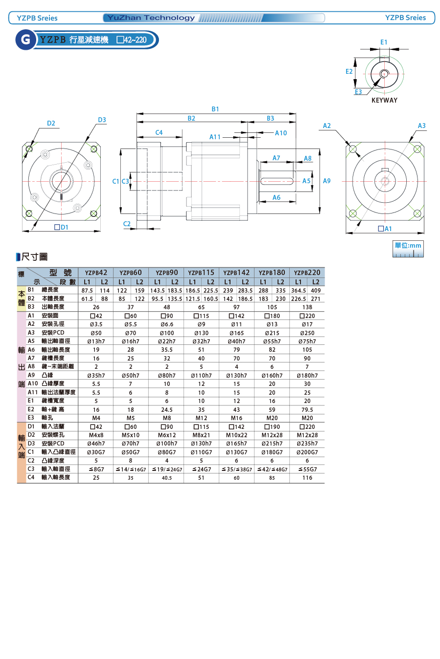 SeriesL1 一段 Single stage L2 二段 Double stage 3、4、5、8、10 15、20、25、30、35、4050、80、100系列名 輸出軸 (mm) KEYWAY(mm) YZPB42 13 5 YZPB60 16 5 YZPB90 22 6 YZPB115 32 10 YZPB142 40 12 YZPB180 55 16 YZPB220 75 20 -