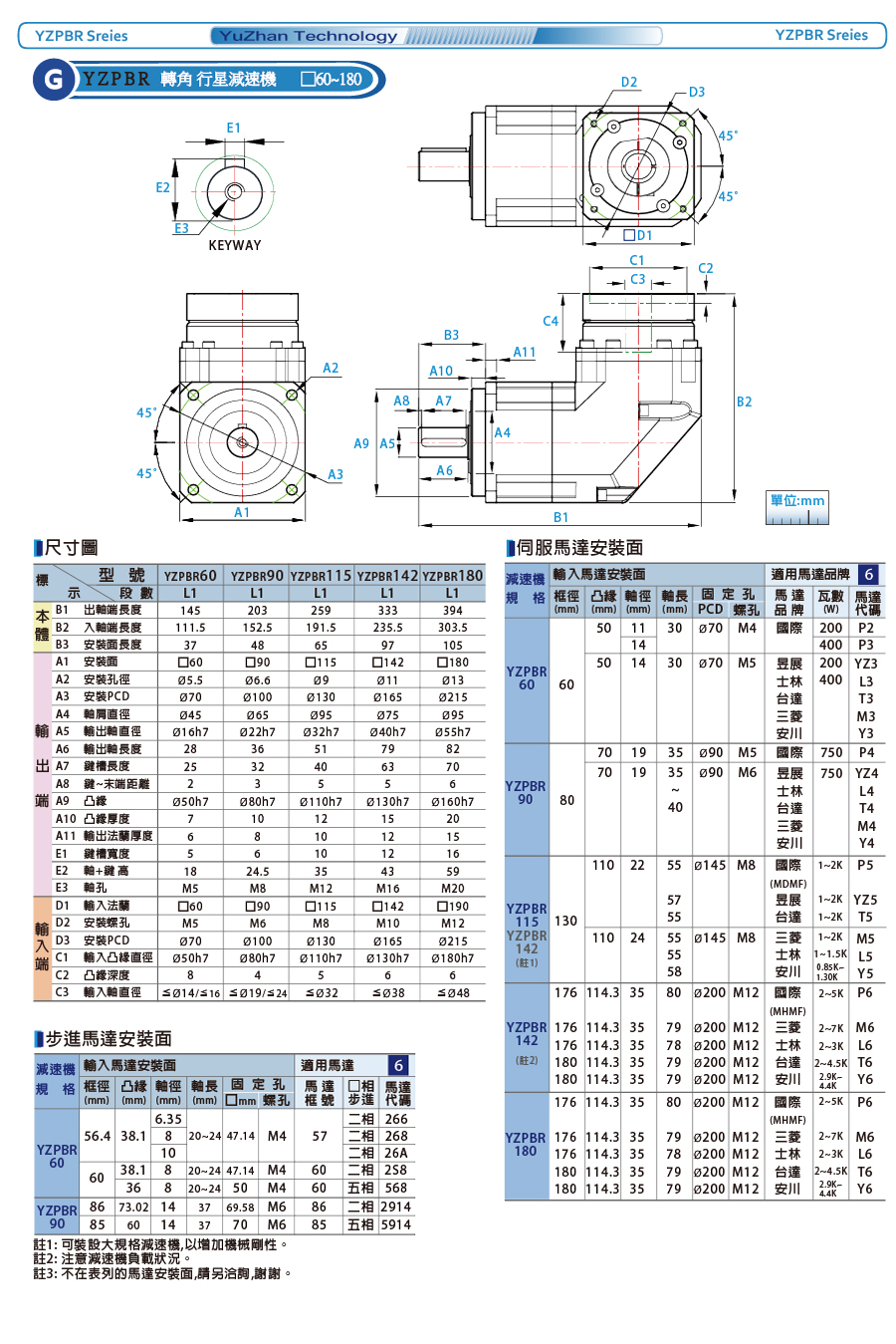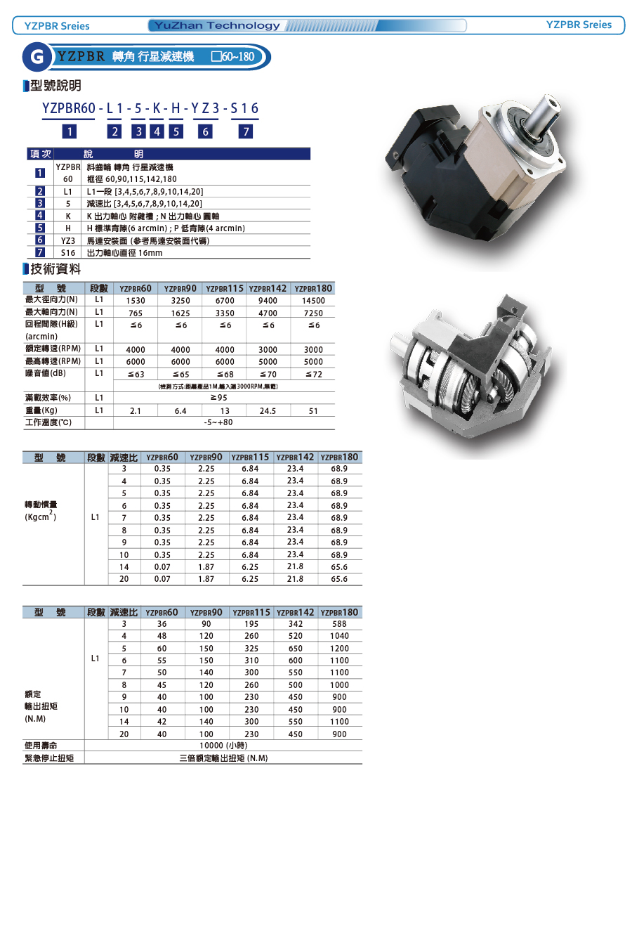 明YZ- PBR60- L1 - 5 - K - H - P3 - S16 公司名 系列名 段數 減速比 馬達軸心 背隙 馬達品牌/瓦數 出力軸 規格選擇 PBR60
