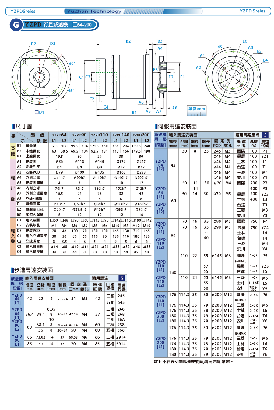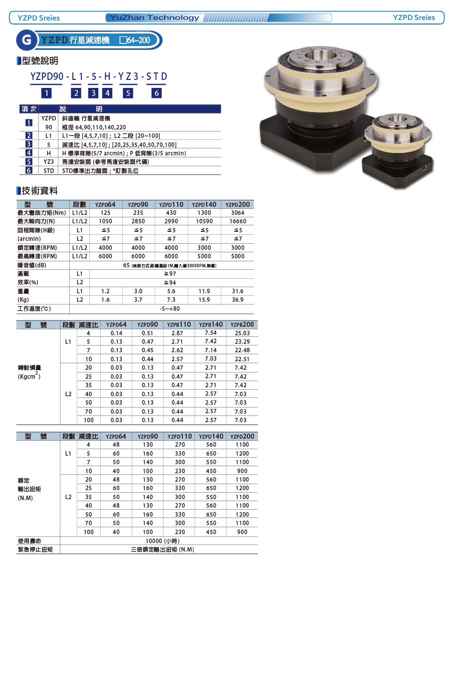 明YZ- PD64- L1 - 5 - H - P3 - STD 公司名 系列名 段數 減速比 背隙 馬達品牌/瓦數 出力圓盤 規格選擇 安裝直徑